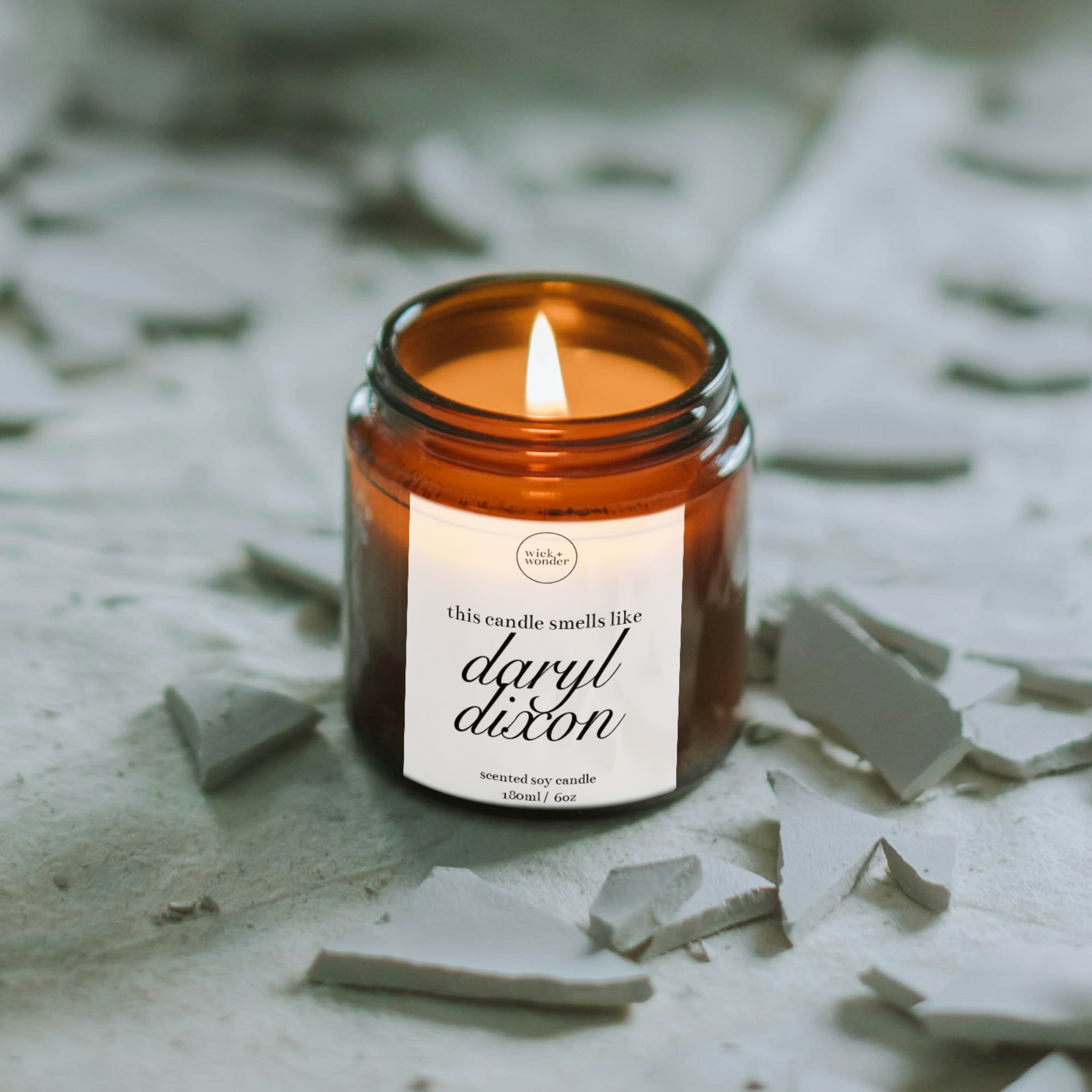 This 'Smells Like Daryl Dixon Candle' is the ultimate gift for fans of The Walking Dead. Hand-crafted with luxury soy wax and cotton wick, this Daryl Dixon candle features a beautiful, mystery scent inspired by your favourite TV character. You have 2 sizes to choose from: a 120ml clear glass jar, or a 180ml amber glass jar candle. Both versions come with a lid closure and a hand-drawn illustration for a super stylish finish.